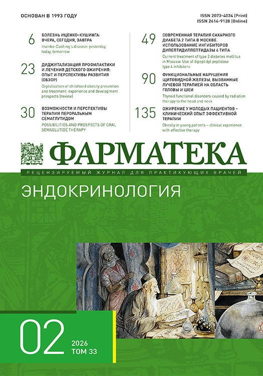 Барсуков Илья Алексеевич, к.м.н., старший науч. сотр. отделения терапевтической эндокринологии, Московский областной научно-исследовательский институт им. М.Ф. Владимирского; главный специалист по направлению «эндокринология» сети федеральных центров, АО «Группа компаний МЕДСИ», Москва, Россия; palantirr@inbox.ru, ORCID: https://orcid.org/0000-0002-1889-8555, Scopus Author ID: 57225446501, eLibrary SPIN: 7946-8566 (автор, ответственный за переписку)Демина Анна Александровна, науч. сотр. отделения терапевтической эндокринологии, Московский областной научно-исследовательский институт им. М.Ф. Владимирского, Москва, Россия; annagalitskova@gmail.com, ORCID: https://orcid.org/0000-0002-7742-5782, Scopus Author ID: 58318134200, eLibrary SPIN: 2345-6369